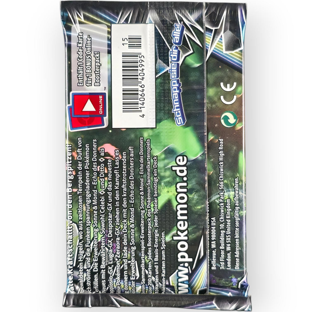 Spüre die Zeitreise-Magie! Dieses versiegelte Echo des Donners Booster zeigt das legendäre Celebi. Als eines der größten Sets der Sonne & Mond Ära bietet es eine unglaubliche Vielfalt an starken Karten.